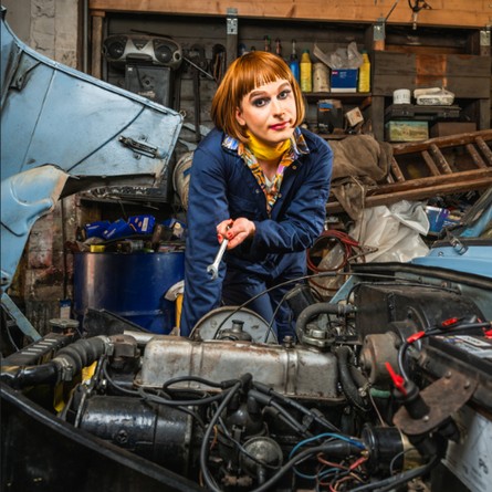 Matt can’t do this alone, which is tricky for a solo show. That’s where Matt’s drag alter-ego Natalie Spanner comes in. She knows all about things that girls like Natalie know about. Like how to build an engine. About maintenance, care and repair.