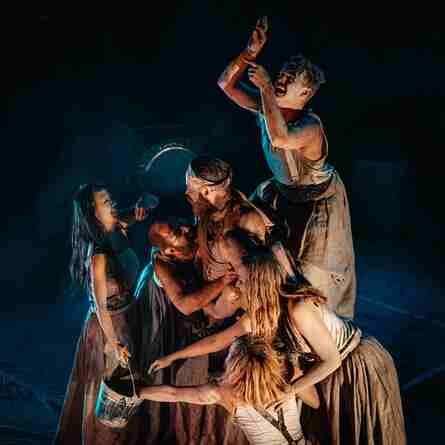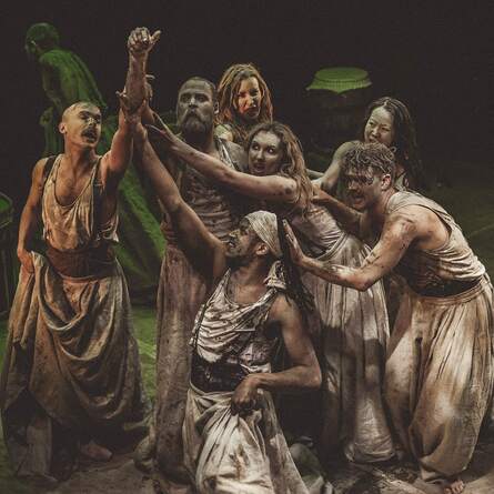 Puppetry, clown, ensemble, physical theatre, and exhilarating live music, combine in a powerful and provocative interpretation. A stripped back set, an aesthetically arresting design, and a tightknit ensemble of actors, this performance is a dark and visceral manifestation of the work’s essence and underlaying themes, drawing out the parallels with modern society.